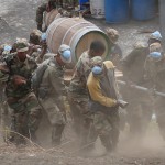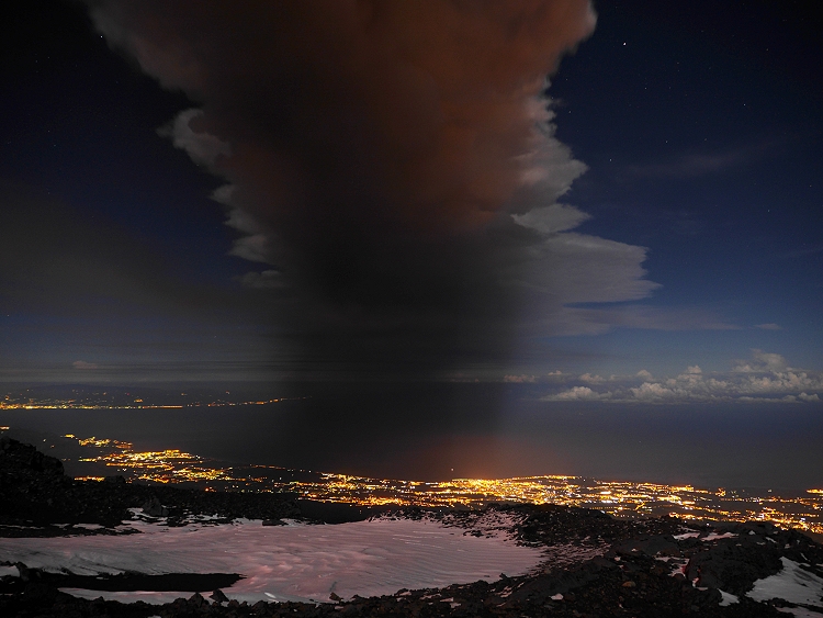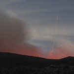 At first, only a few isolated lava lumps were ejected from the mouths of the chimneys, but pretty soon the activity increased to continuous lava spattering. Isolated lava bombs reached respectable heights of about 50 meters. Also the size of the cinders was impressive.